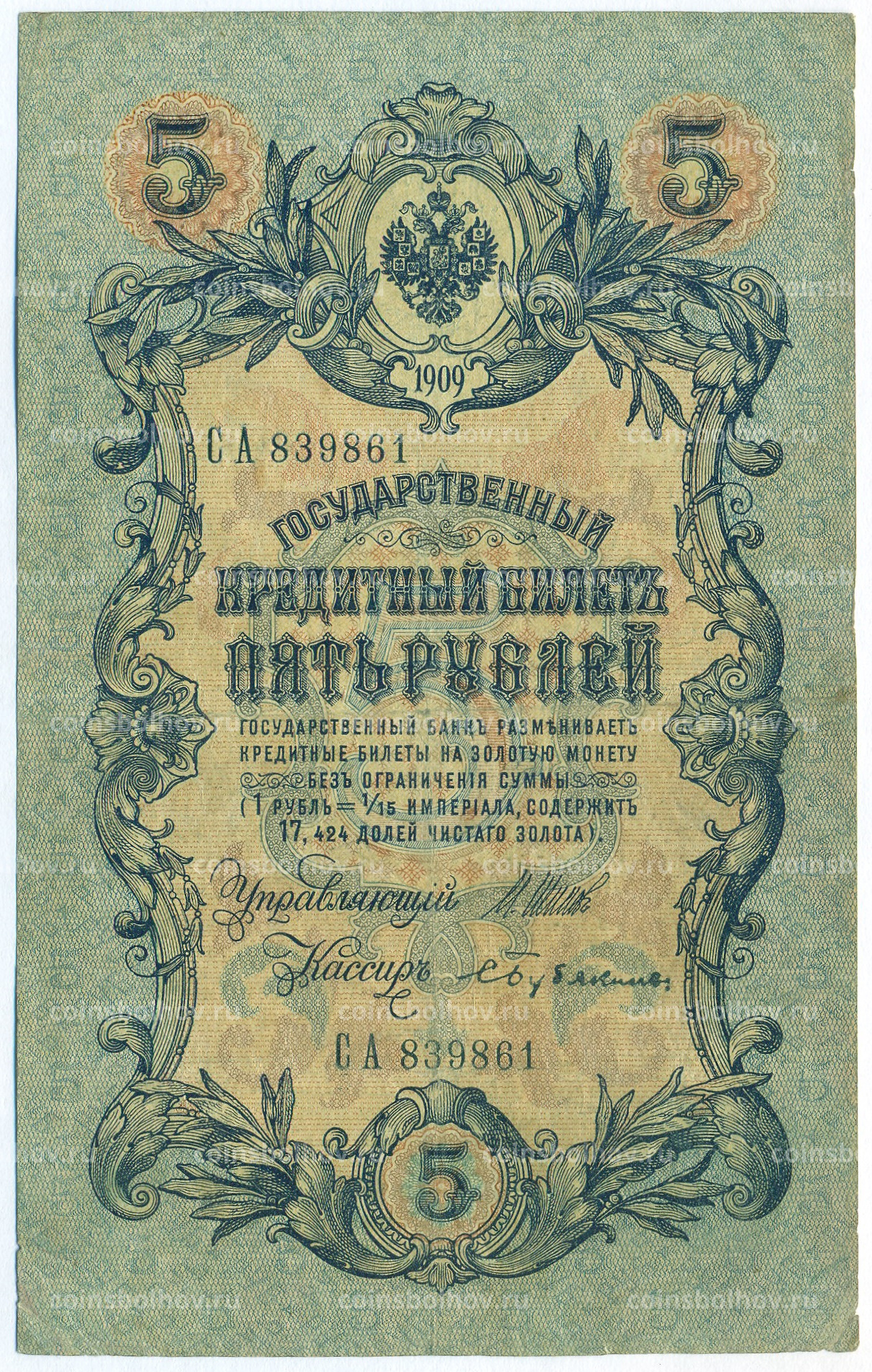 Банкнота 5 рублей 1909 года Шипов / Бубякин