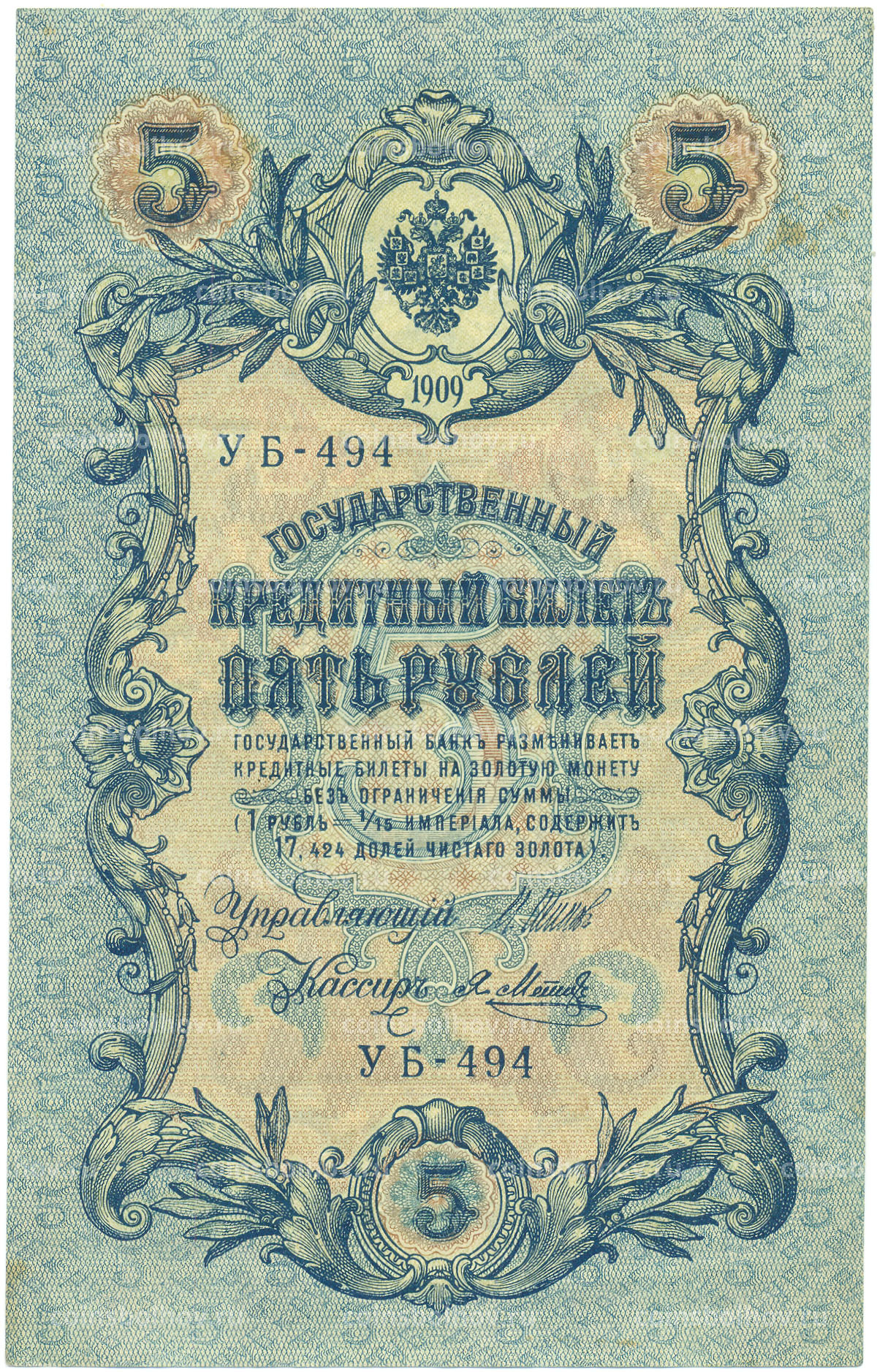 Банкнота 5 рублей 1909 года Шипов / Метц