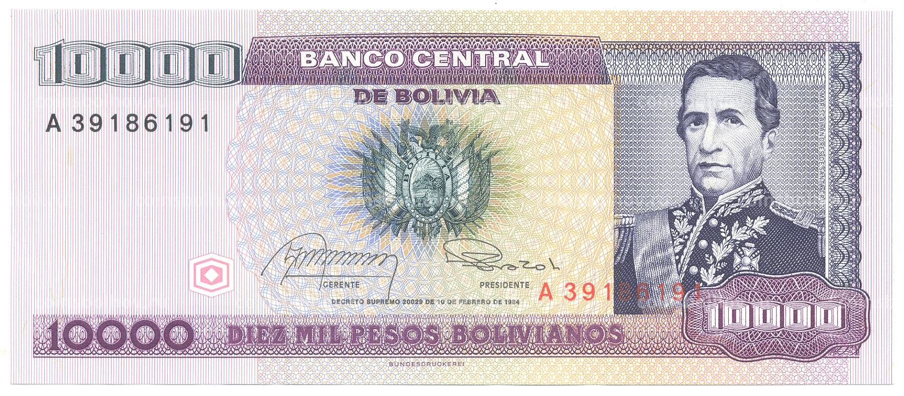 10000 песо 1984 года Боливия