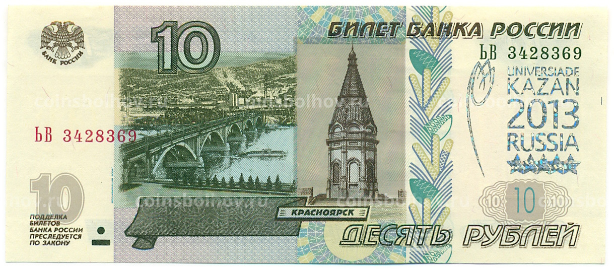 10 рублей 1997 года (Модификация 2004 года) Надпечатка «Универсиада в Казани 2013»