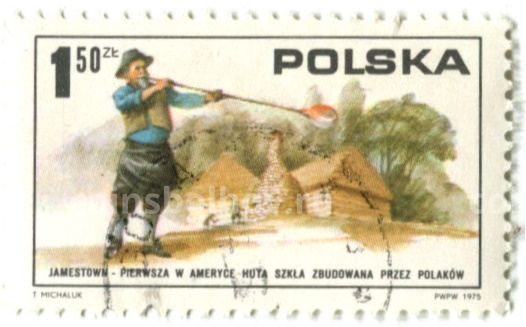 Марка «первый стекольный завод в Джеймстауне построен поляками» 1975 год Польша