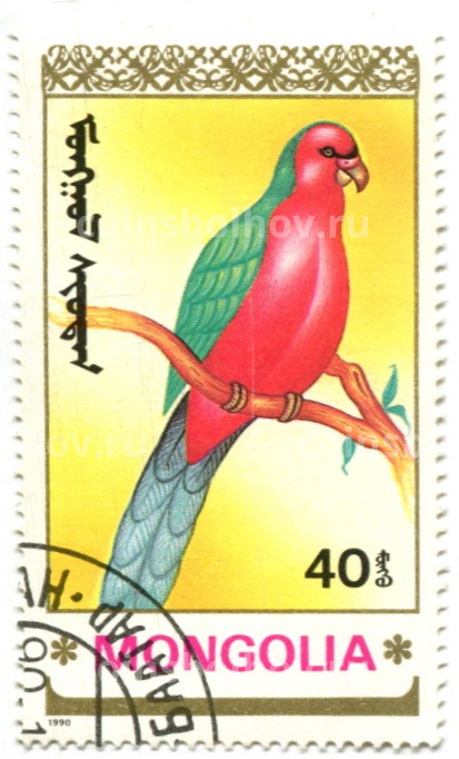 Марка 40 мунгу «Попугаи» 1990 год Монголия