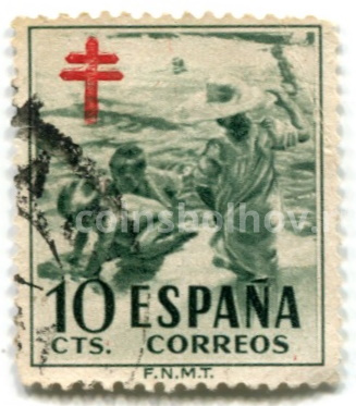 Марка «Дети играют на пляже, Лотарингский крест — почтовый сбор в противотуберкулезный фонд» 1951 год Испания