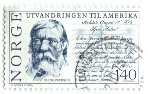 Марка «Кленг Пеерсон 150 лет созданию книги «Эмиграция в Америку» 1975 год Норвегия