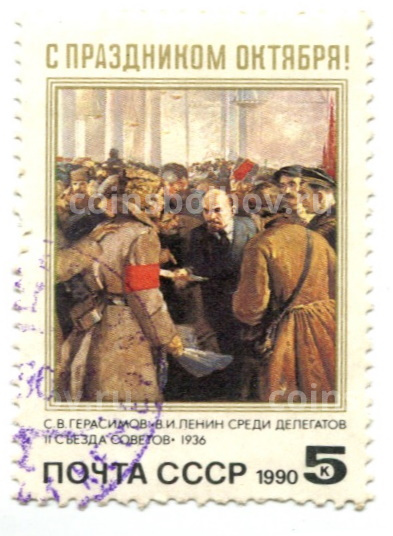 Марка С.В.Герасимов «В.И.Ленин среди делегатов II Съезда Советов « 1990 год