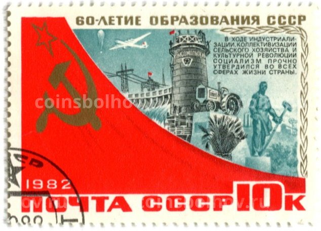Марка «60-летие образования СССР — Индустриальзация и коллективизация сельского хозяйства» 1982 год