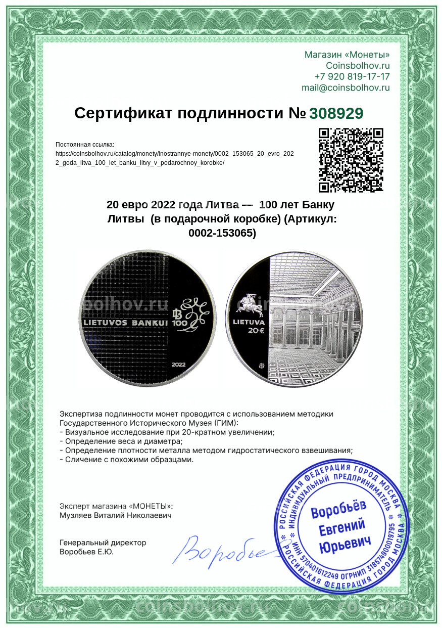 Монета 20 евро 2022 года Литва — 100 лет Банку Литвы (в подарочной коробке)