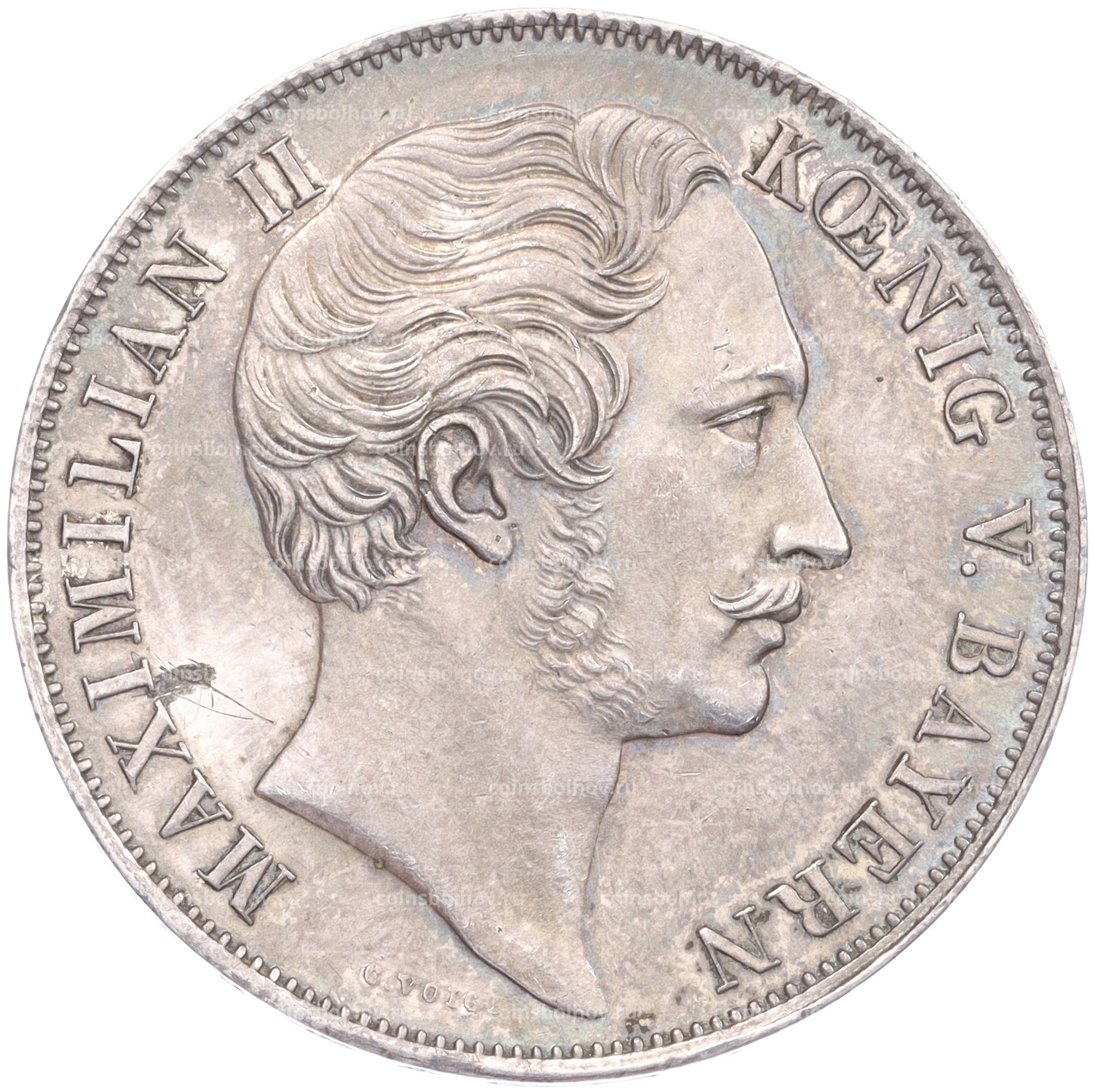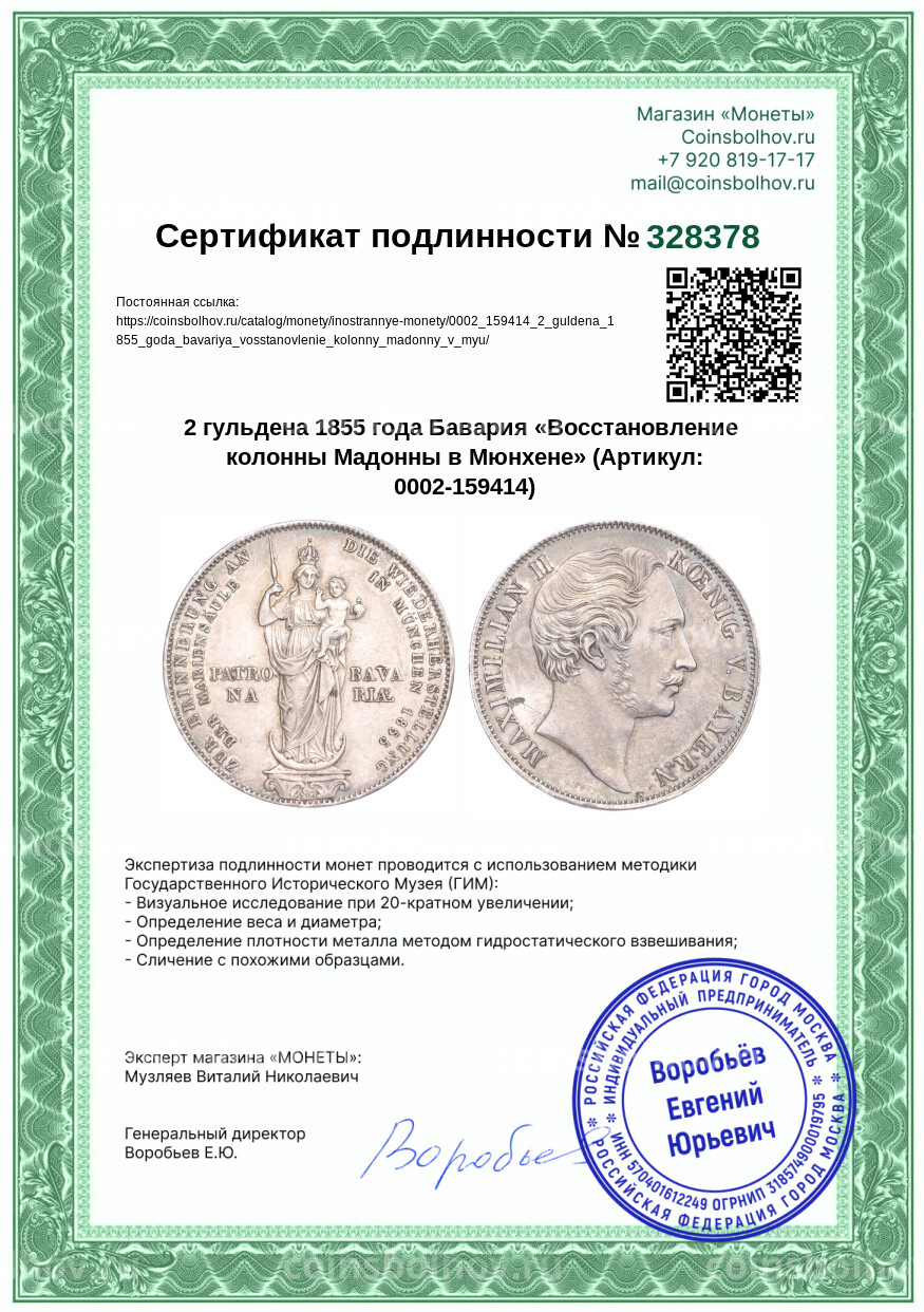 Монета 2 гульдена 1855 года Бавария «Восстановление колонны Мадонны в Мюнхене»