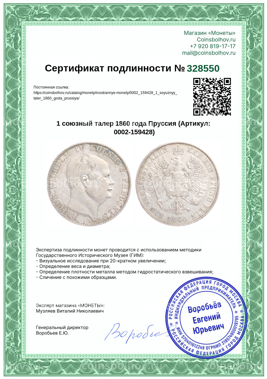 - Номинал 1 талер