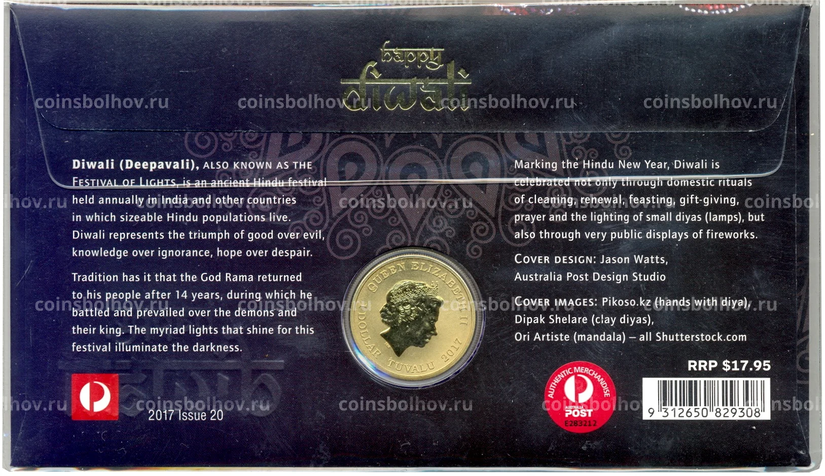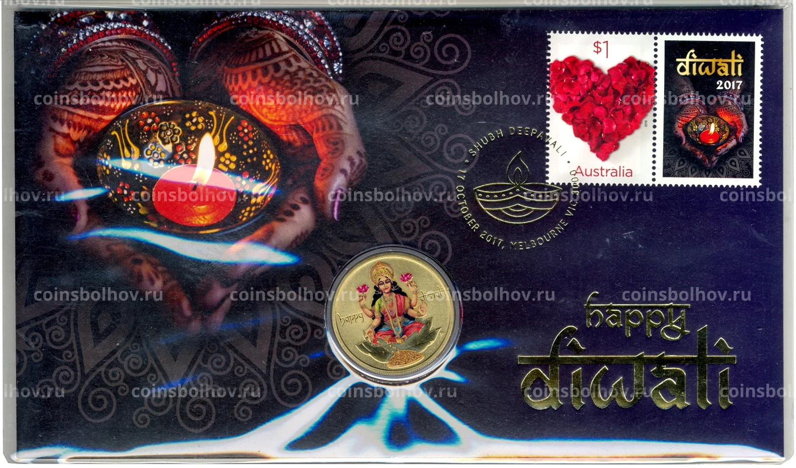 Монета 1 доллар 2017 года Тувалу — Фестиваль Дивали (в конверте с маркой)