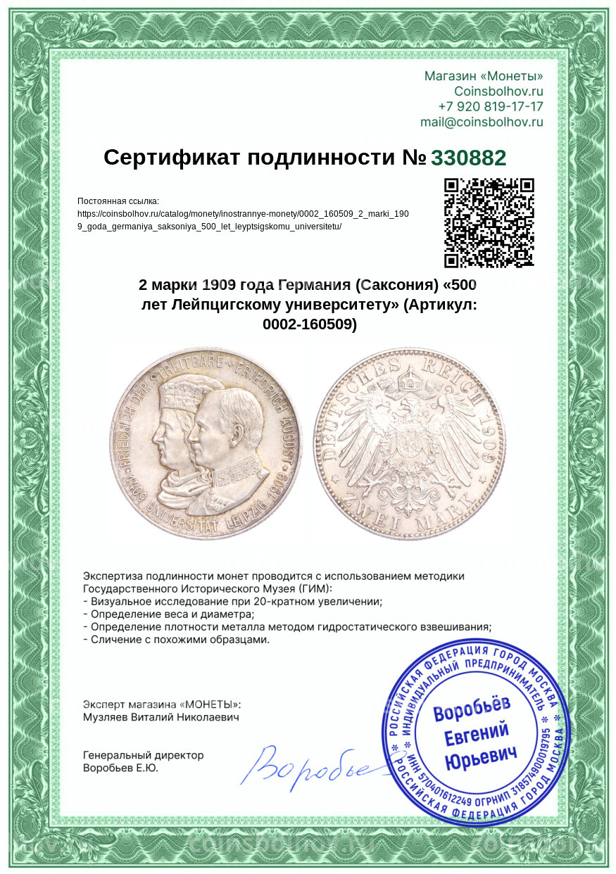 Монета 2 марки 1909 года Германия (Саксония) «500 лет Лейпцигскому университету»