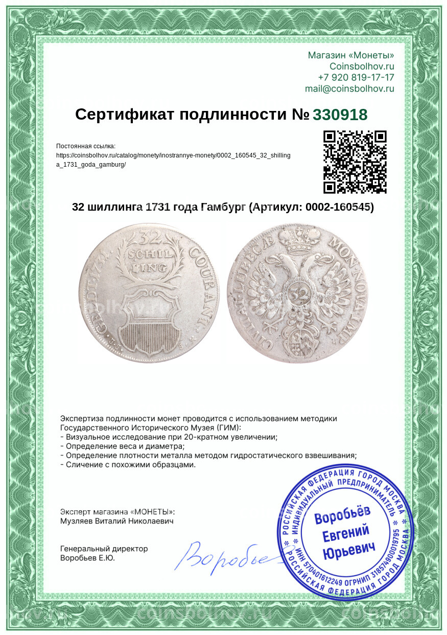 Монета 32 шиллинга 1731 года Гамбург