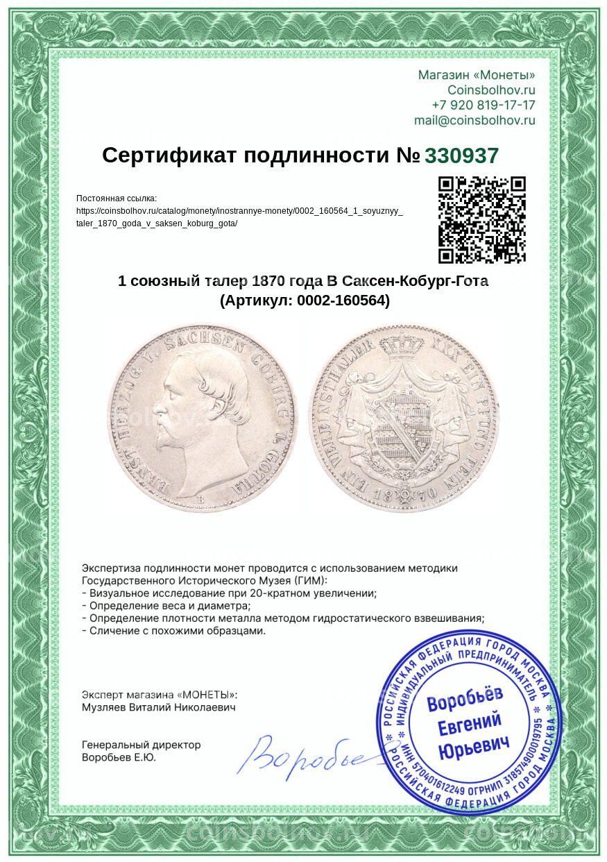 Монета 1 союзный талер 1870 года В Саксен-Кобург-Гота