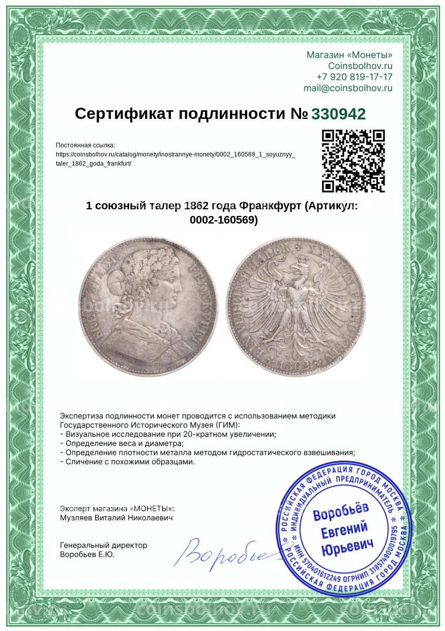 Монета 1 союзный талер 1862 года Франкфурт