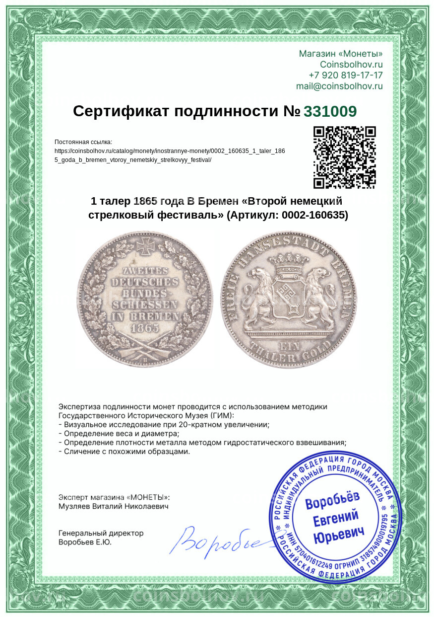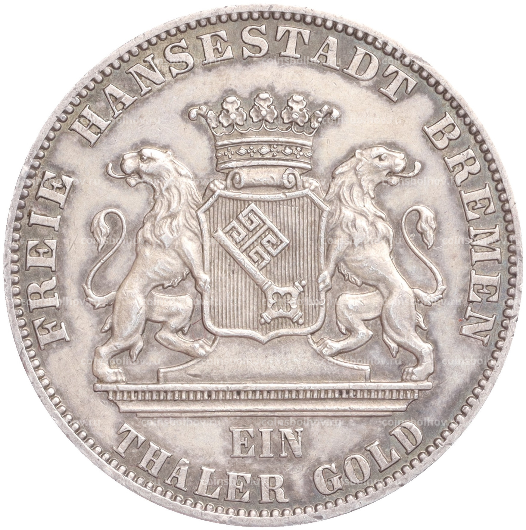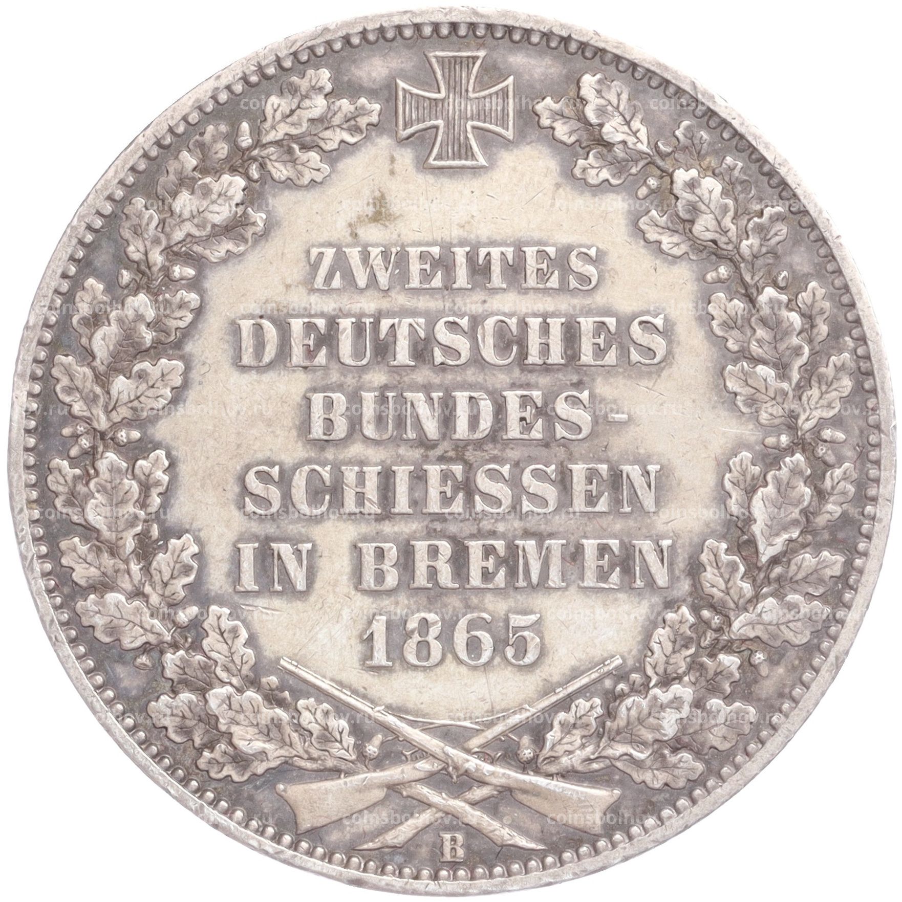 Монета 1 талер 1865 года B Бремен «Второй немецкий стрелковый фестиваль»