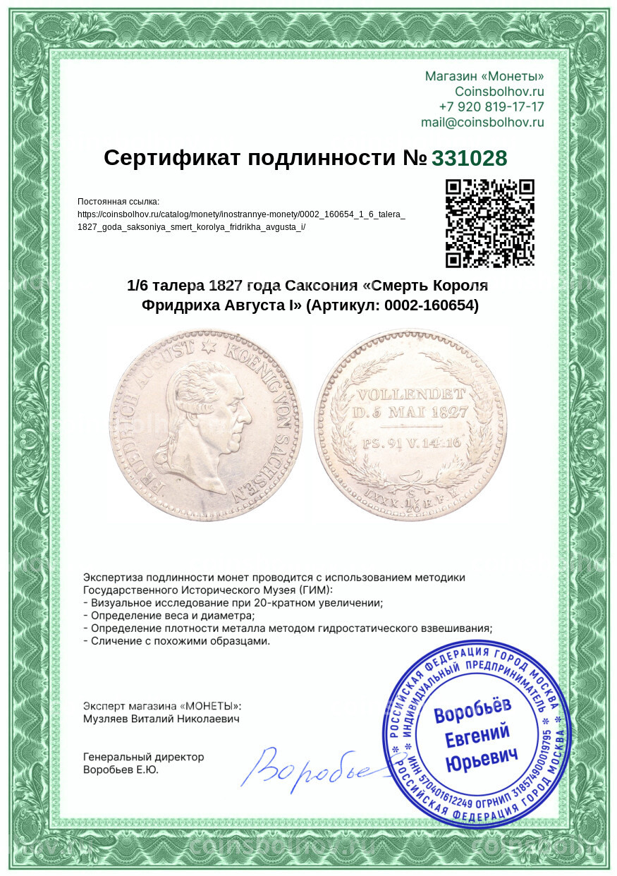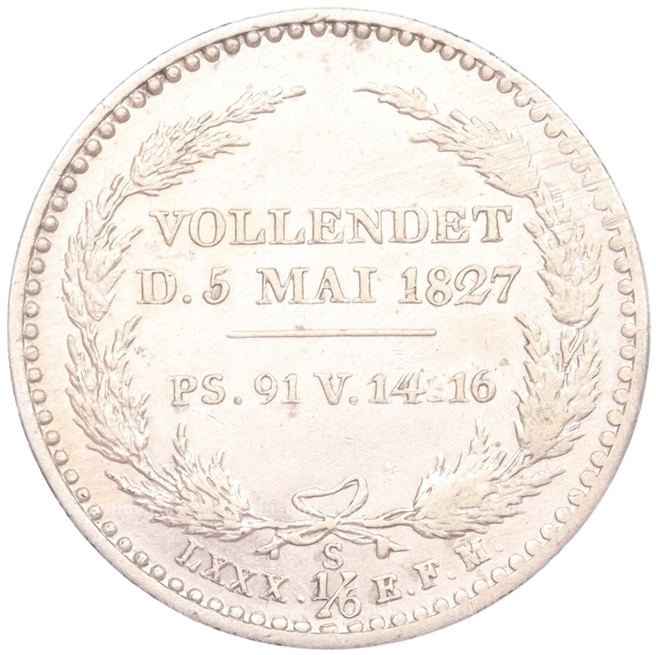 Монета 1/6 талера 1827 года Саксония «Смерть Короля Фридриха Августа I»