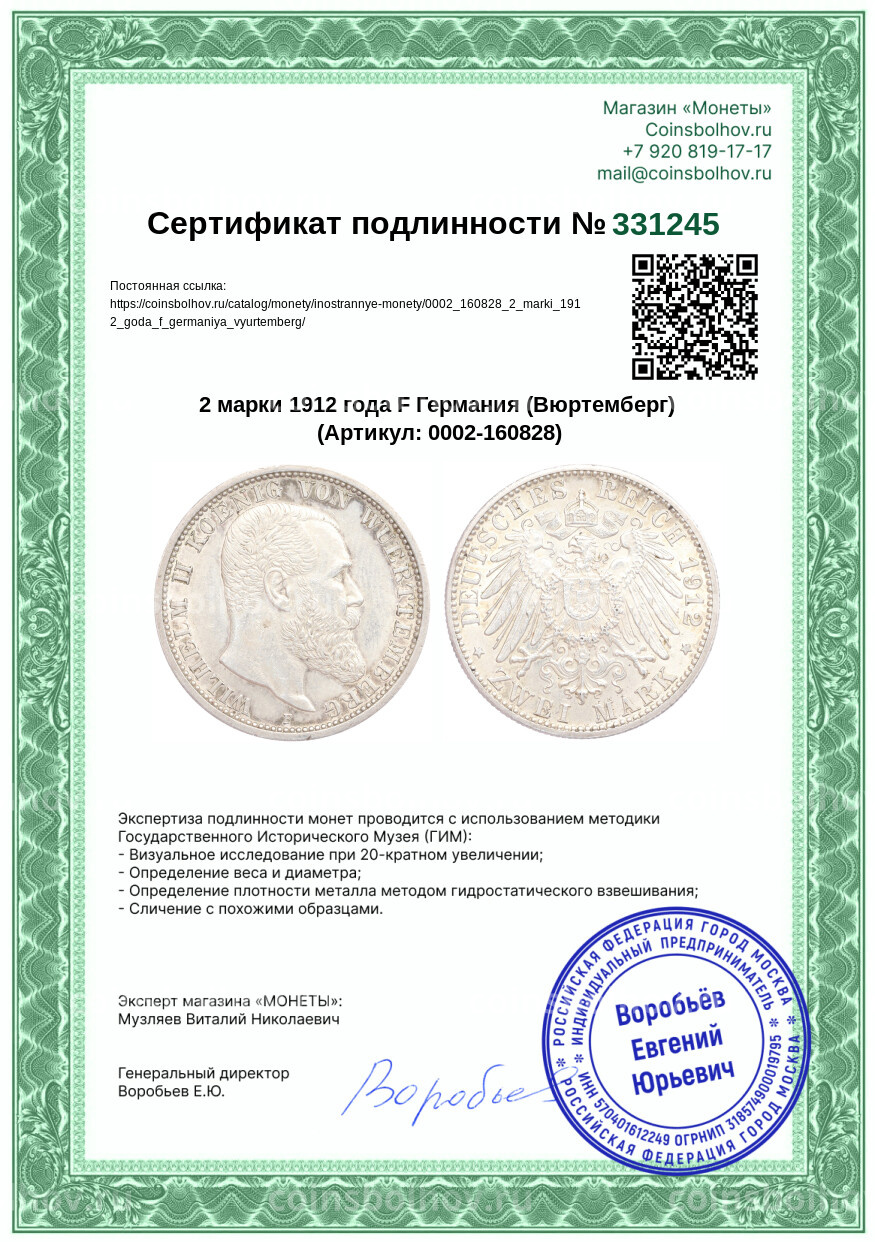 Монета 2 марки 1912 года F Германия (Вюртемберг)
