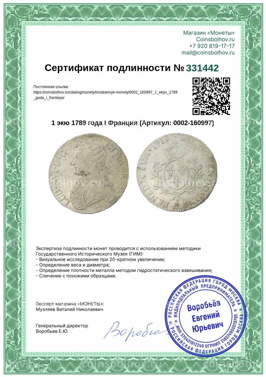 Монета 1 экю 1789 года I Франция