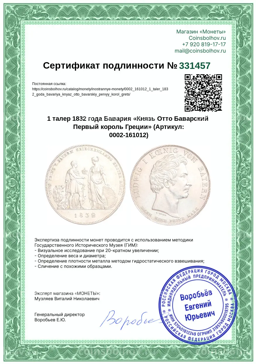 Монета 1 талер 1832 года Бавария «Князь Отто Баварский Первый король Греции»