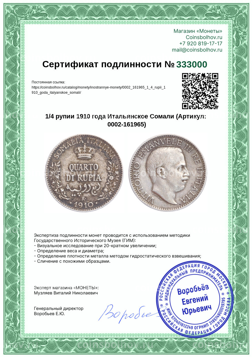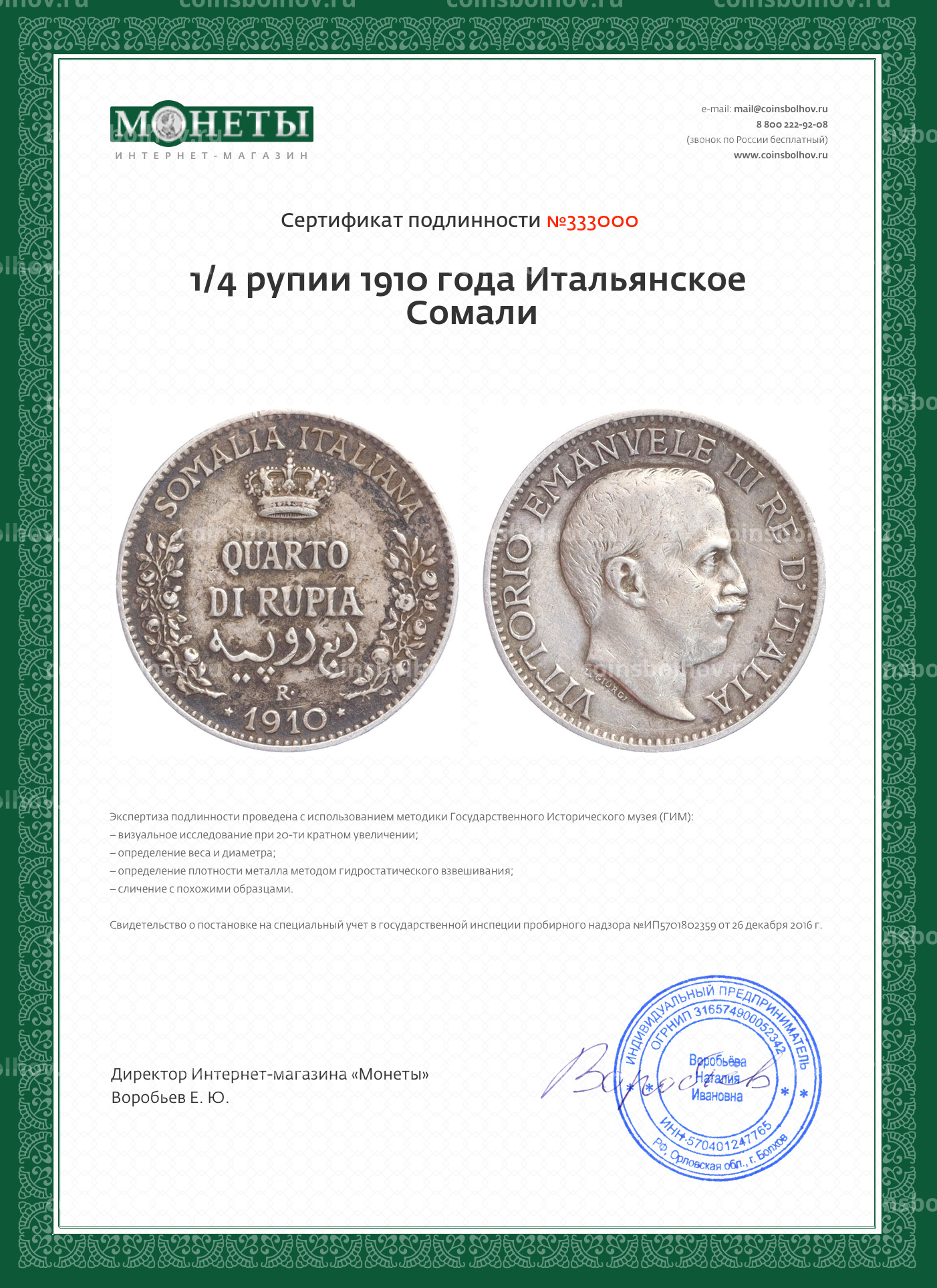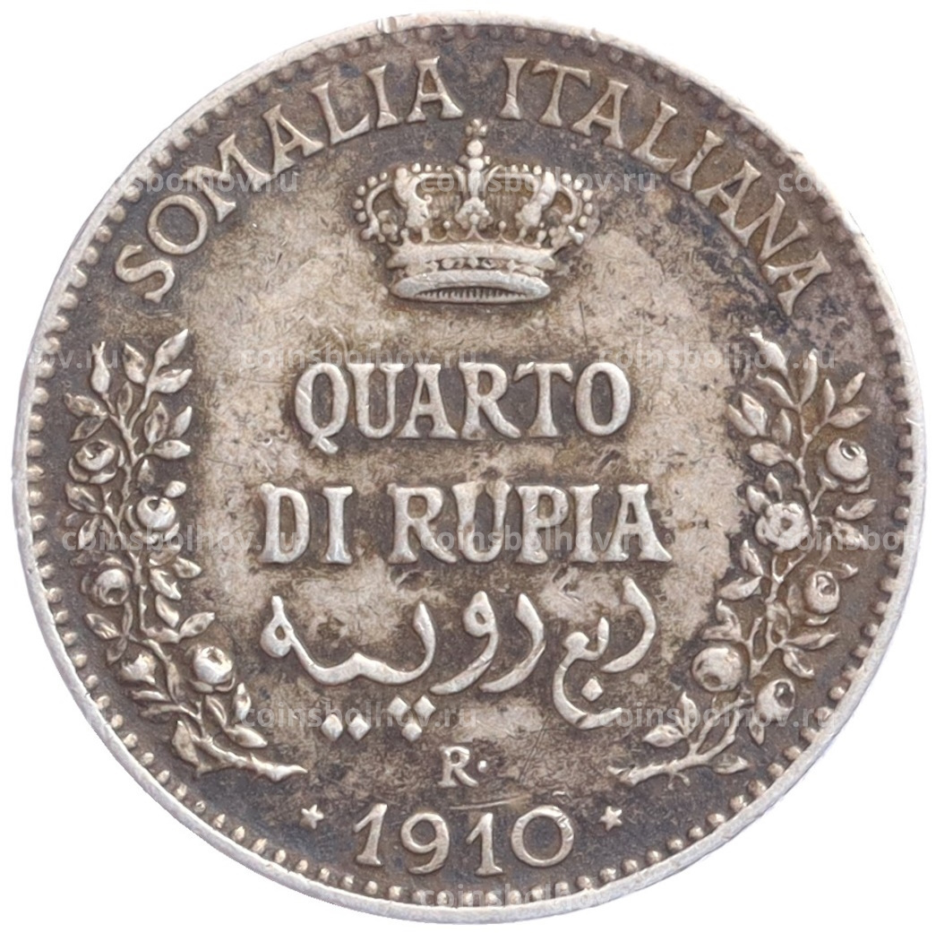 Монета 1/4 рупии 1910 года Итальянское Сомали