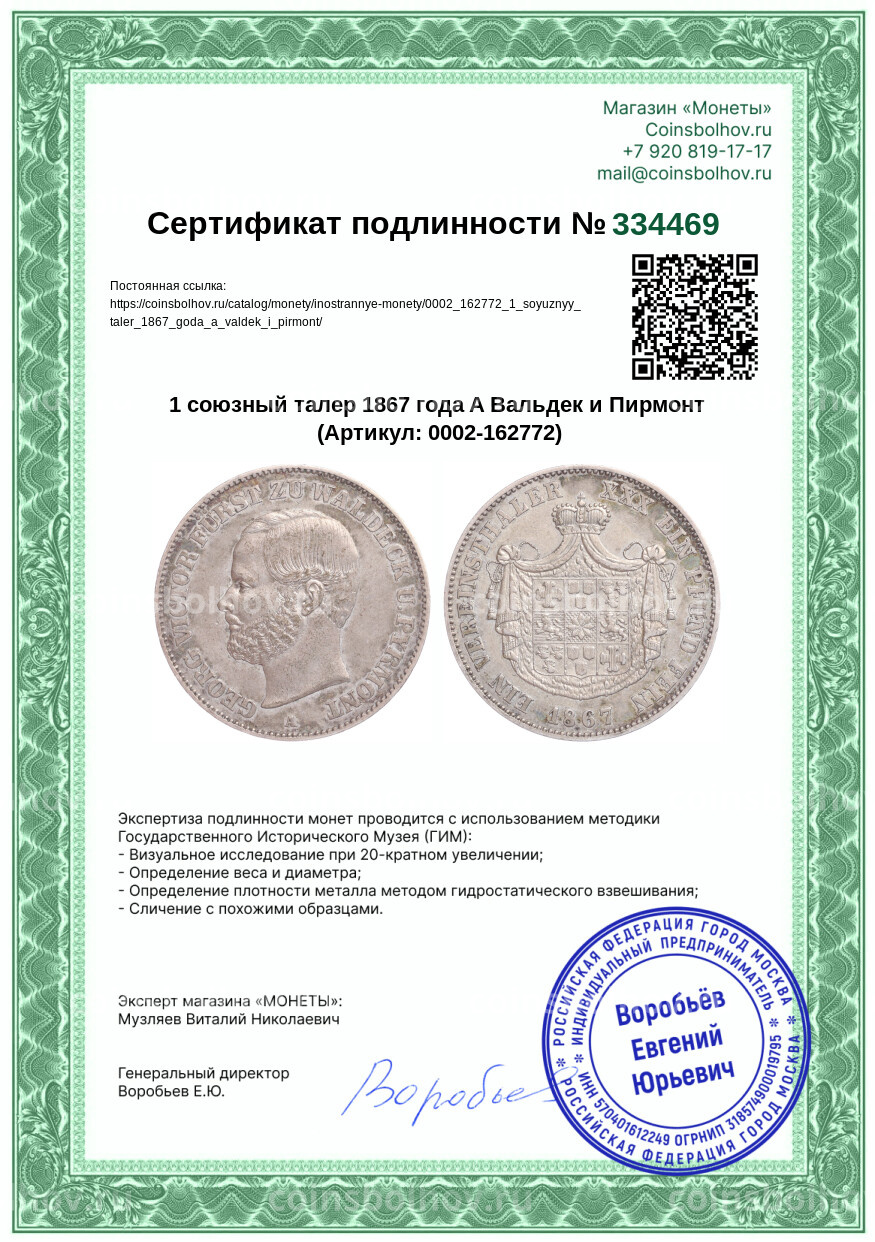 Монета 1 союзный талер 1867 года A Вальдек и Пирмонт