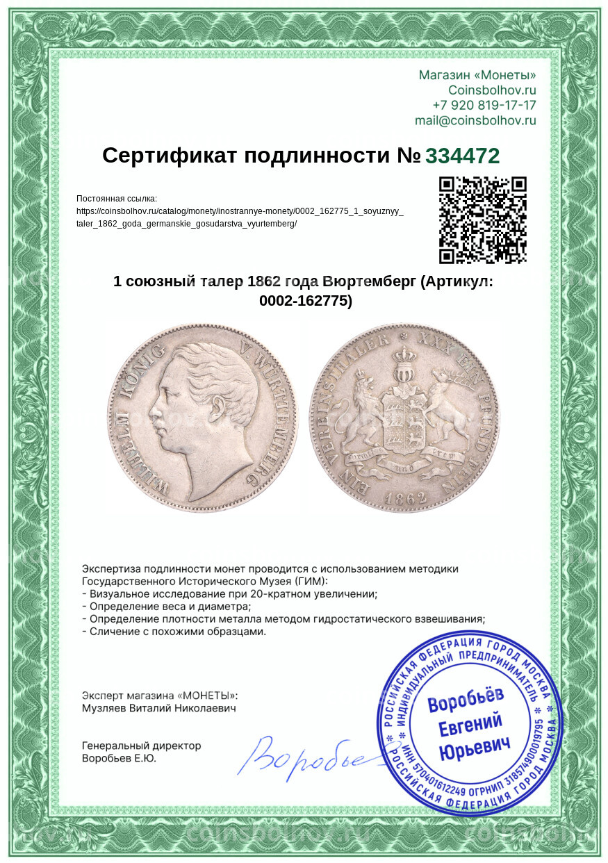 Монета 1 союзный талер 1862 года Вюртемберг