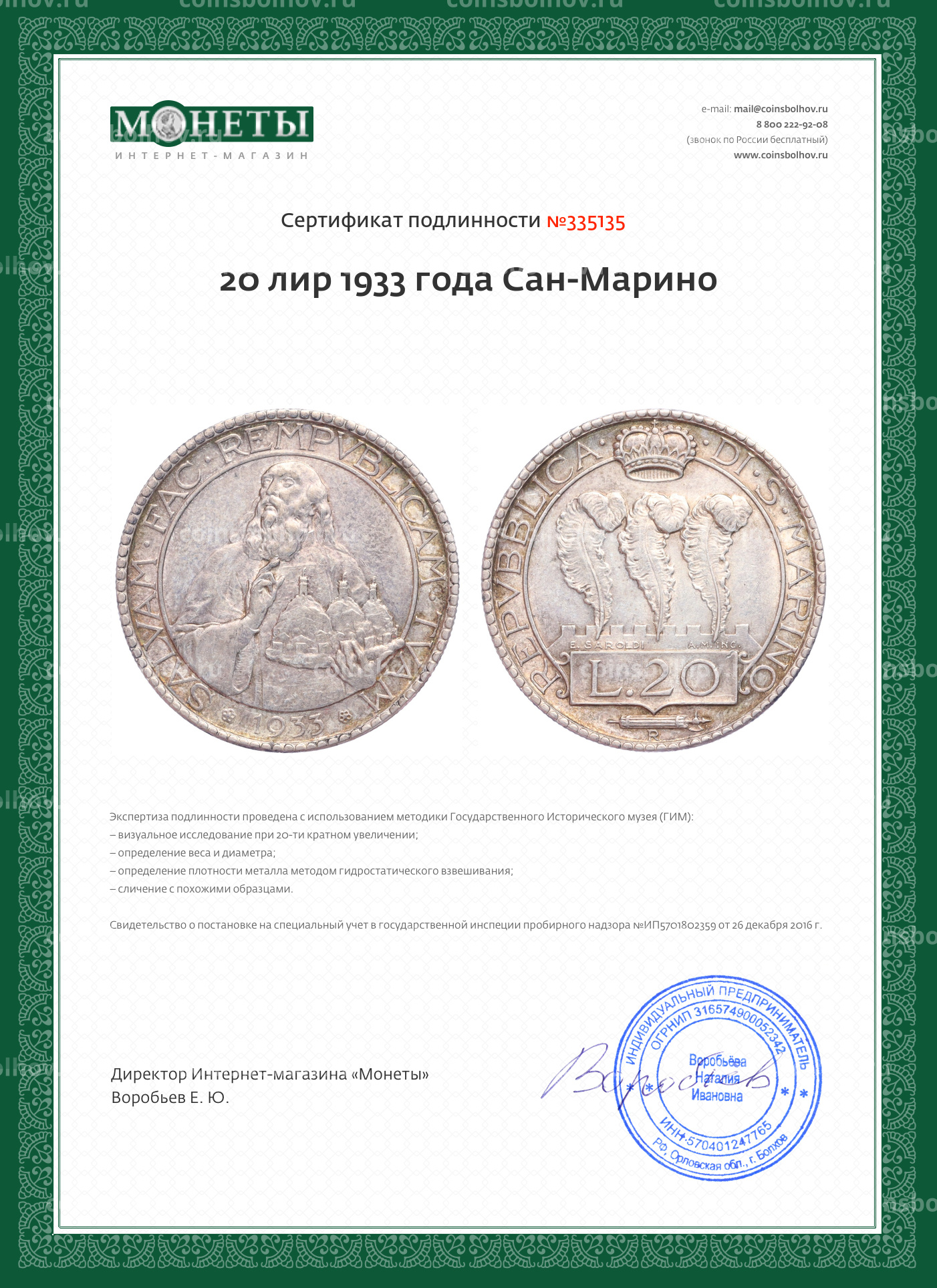 Монета 20 лир 1933 года Сан-Марино