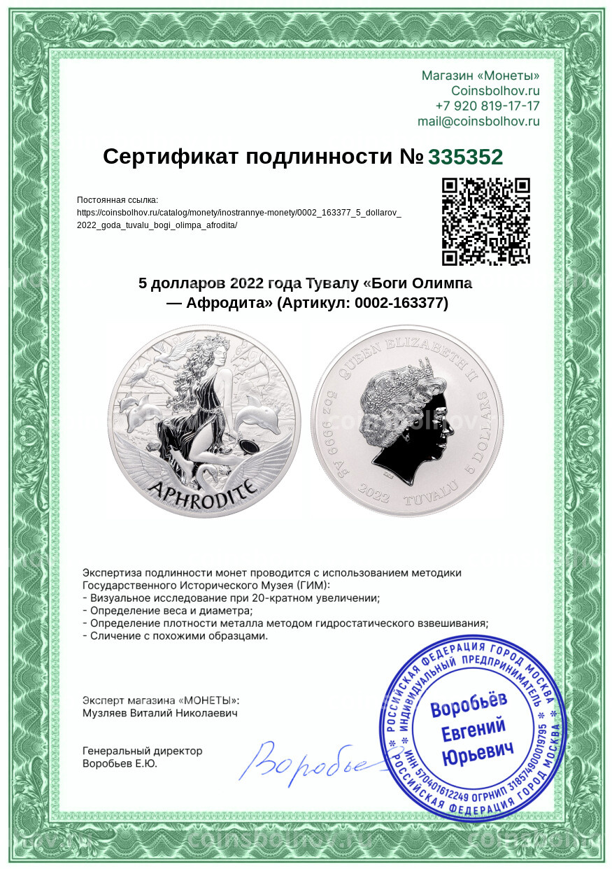 Монета 5 долларов 2022 года Тувалу «Боги Олимпа — Афродита»