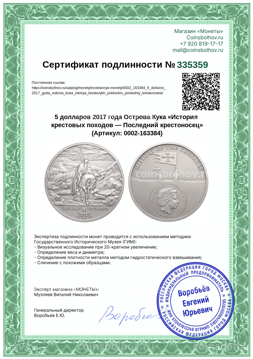 Монета 5 долларов 2017 года Острова Кука «История крестовых походов — Последний крестоносец»