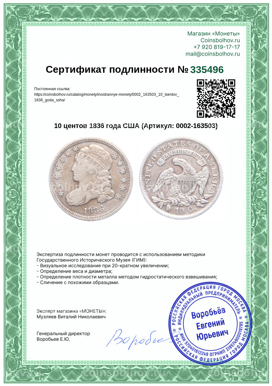 Монета 10 центов 1836 года США