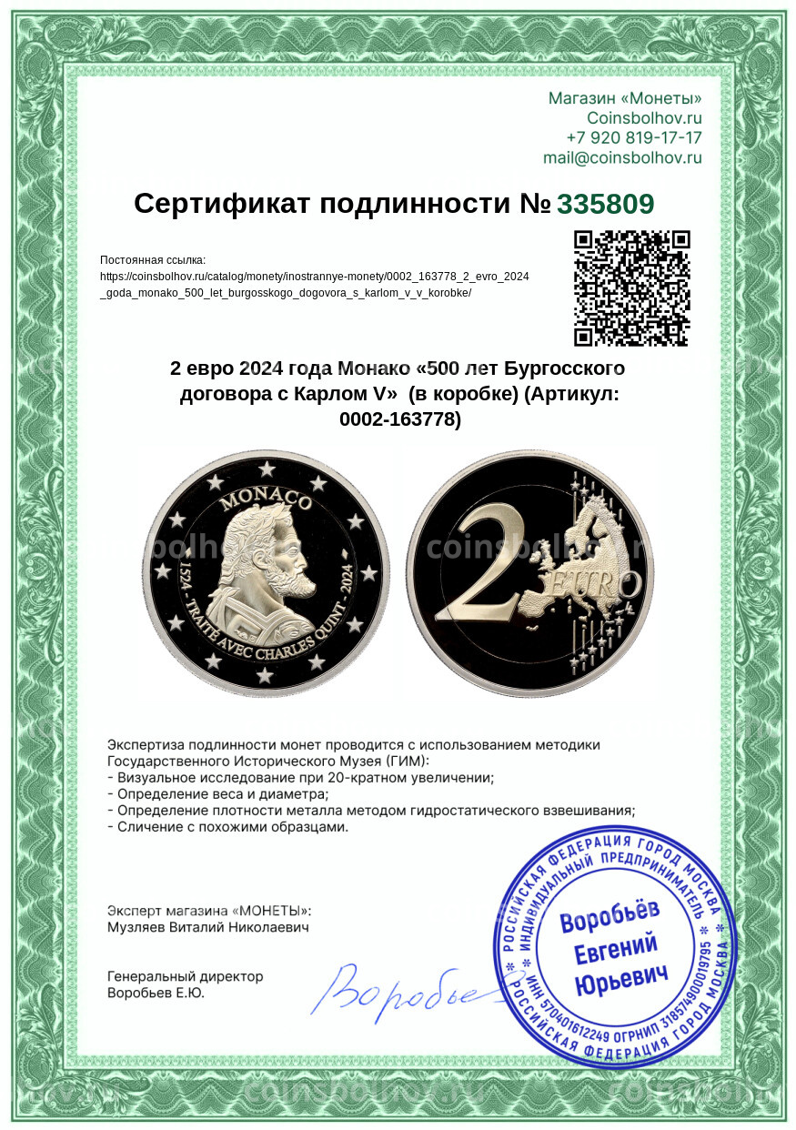 Монета 2 евро 2024 года Монако «500 лет Бургосского договора с Карлом V» (в коробке)