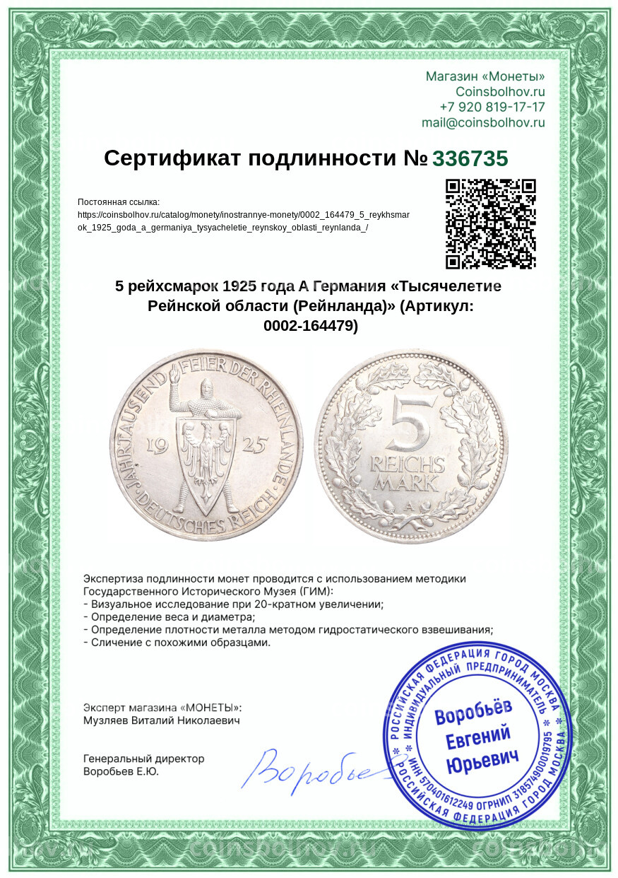 Монета 5 рейхсмарок 1925 года A Германия «Тысячелетие Рейнской области (Рейнланда)»