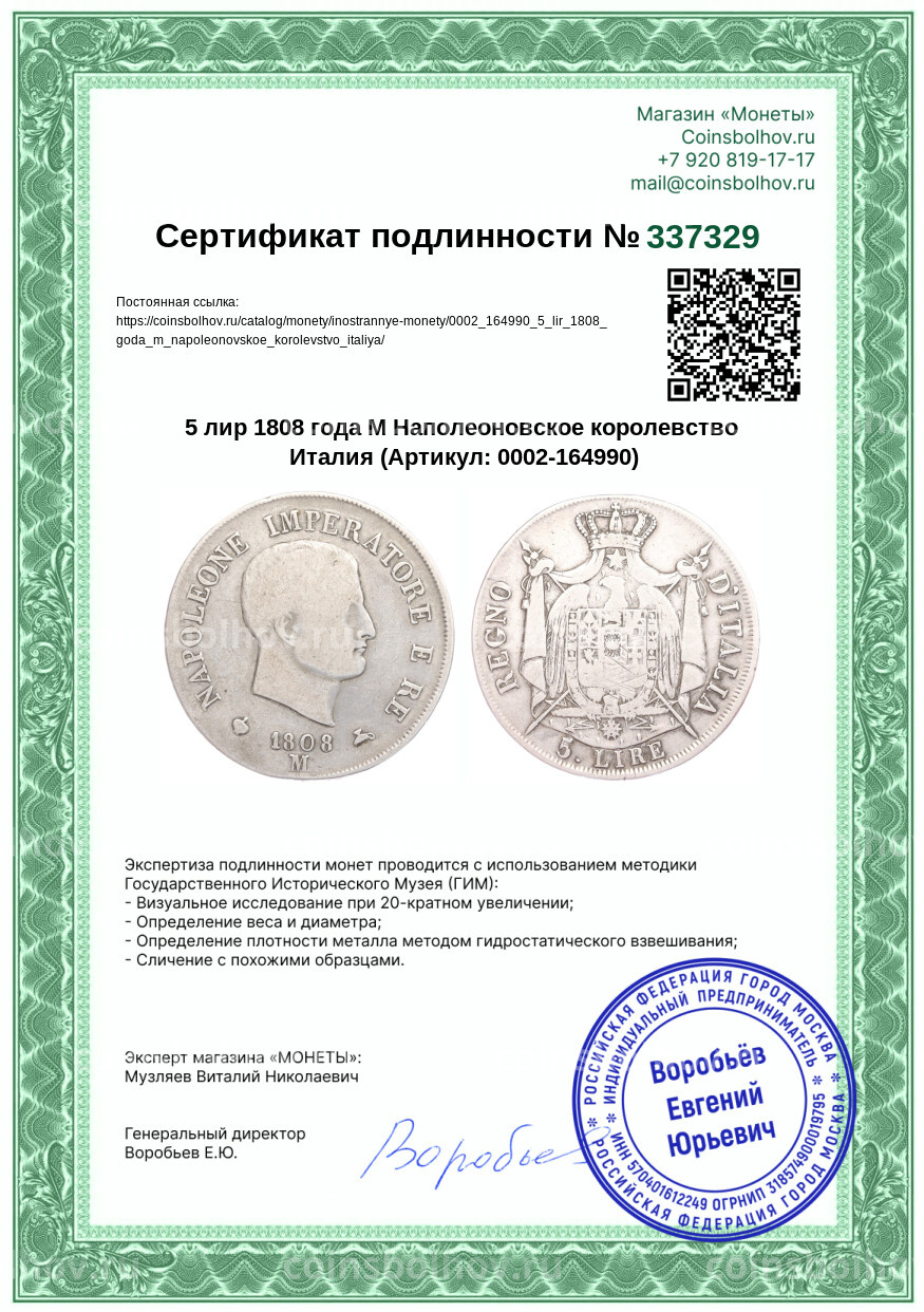 Монета 5 лир 1808 года М Наполеоновское королевство Италия
