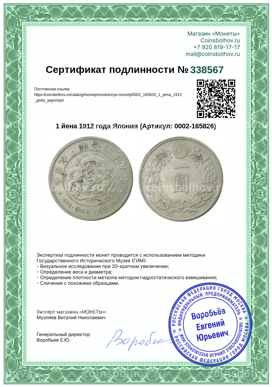 Монета 1 йена 1912 года Япония