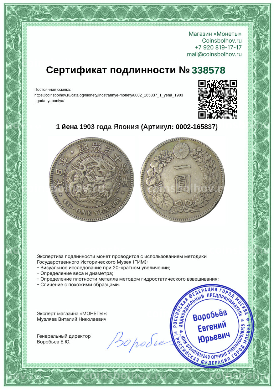 Монета 1 йена 1903 года Япония