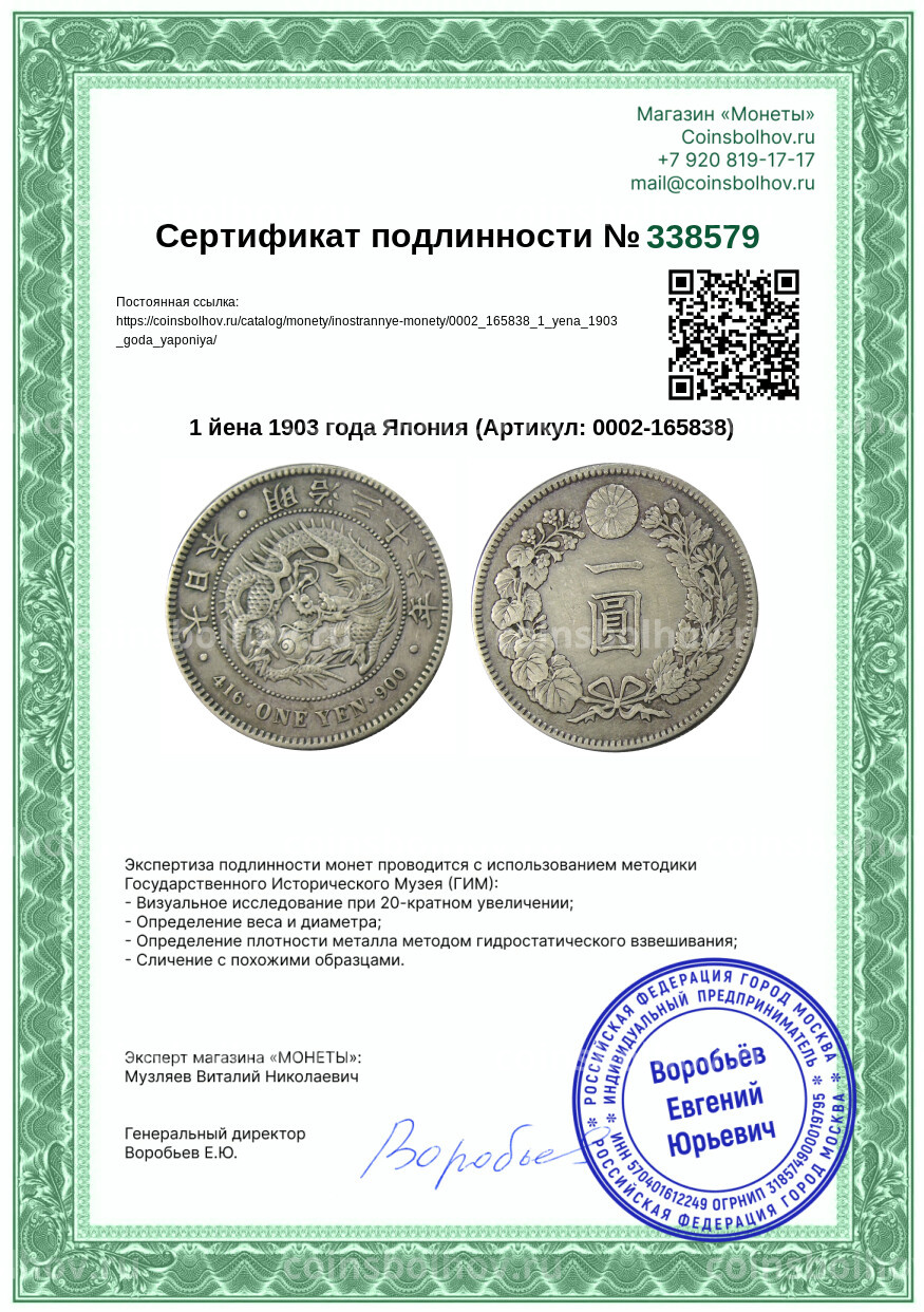 Монета 1 йена 1903 года Япония