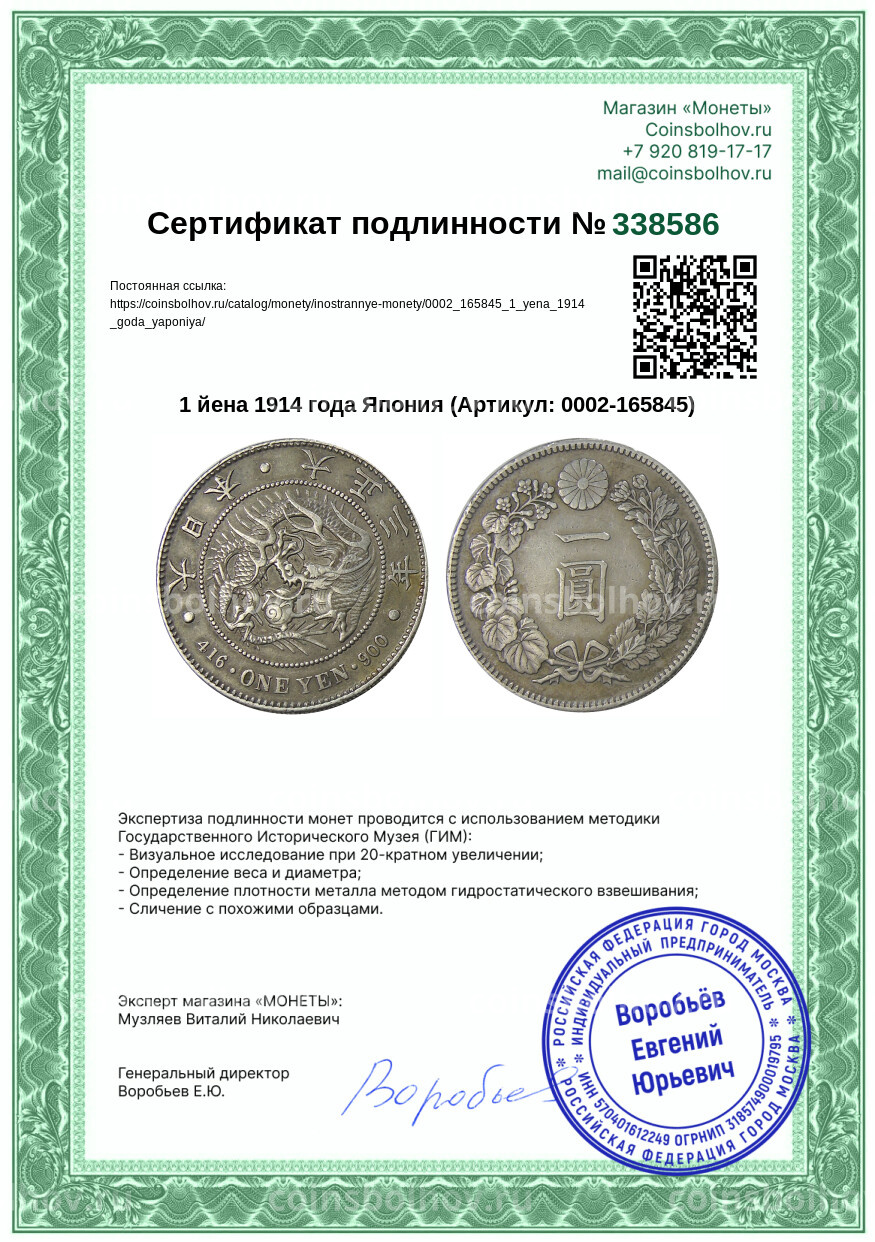 Монета 1 йена 1914 года Япония