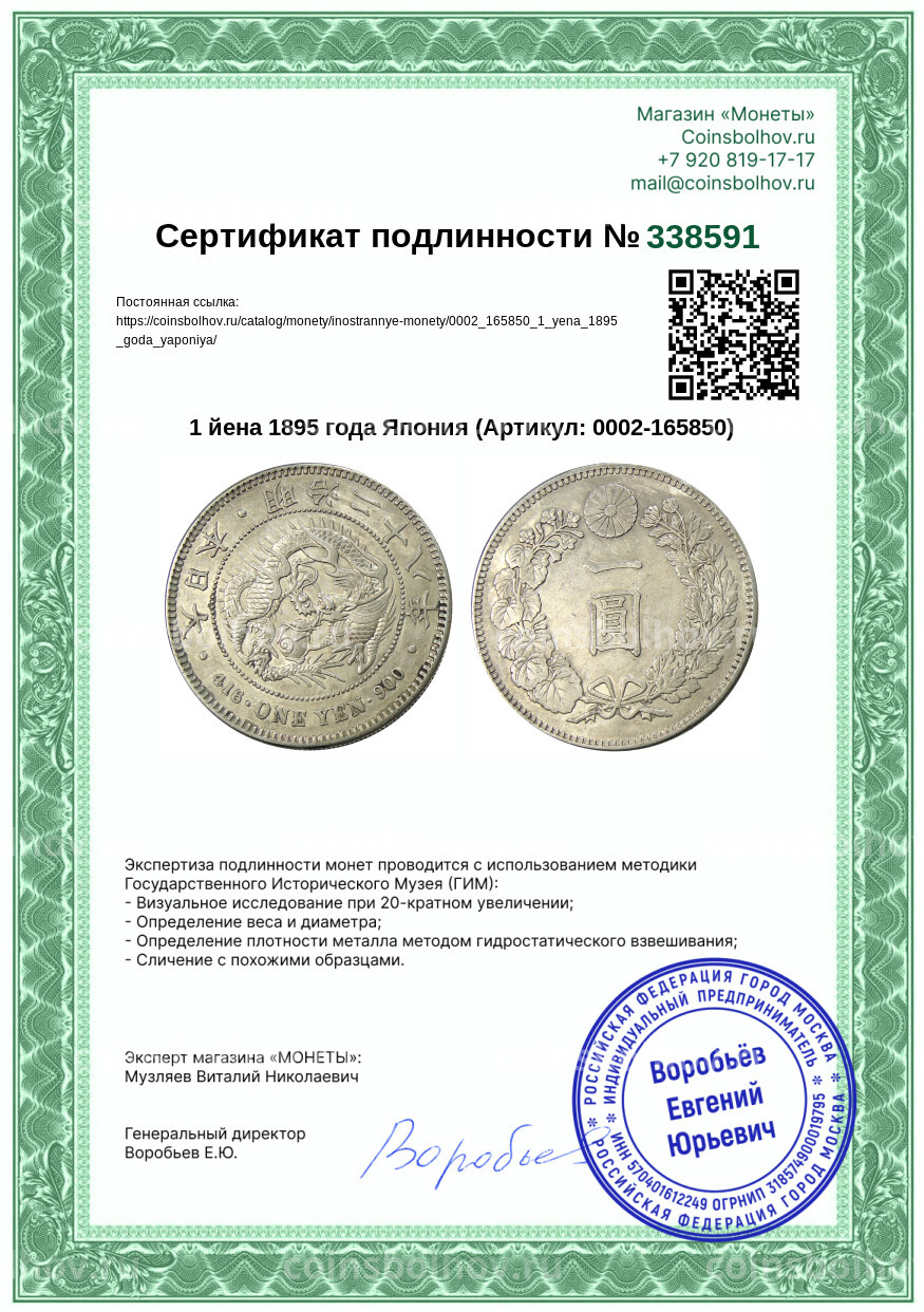 Монета 1 йена 1895 года Япония