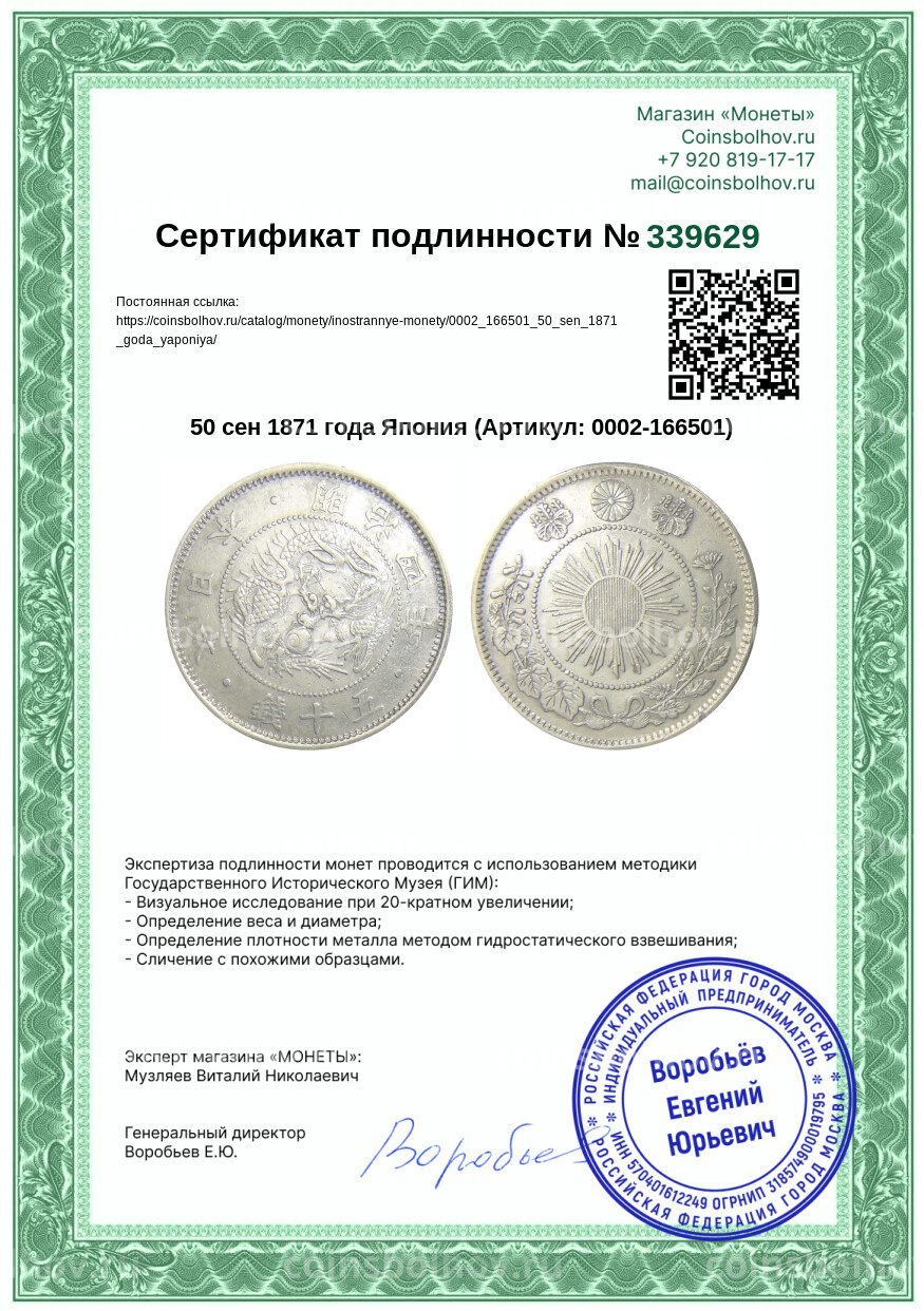 Монета 50 сен 1871 года Япония