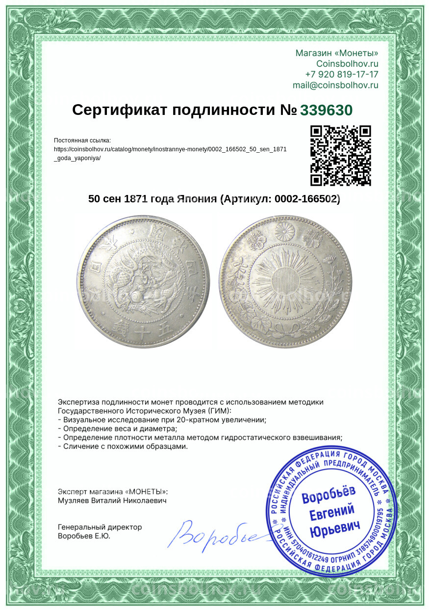 Монета 50 сен 1871 года Япония