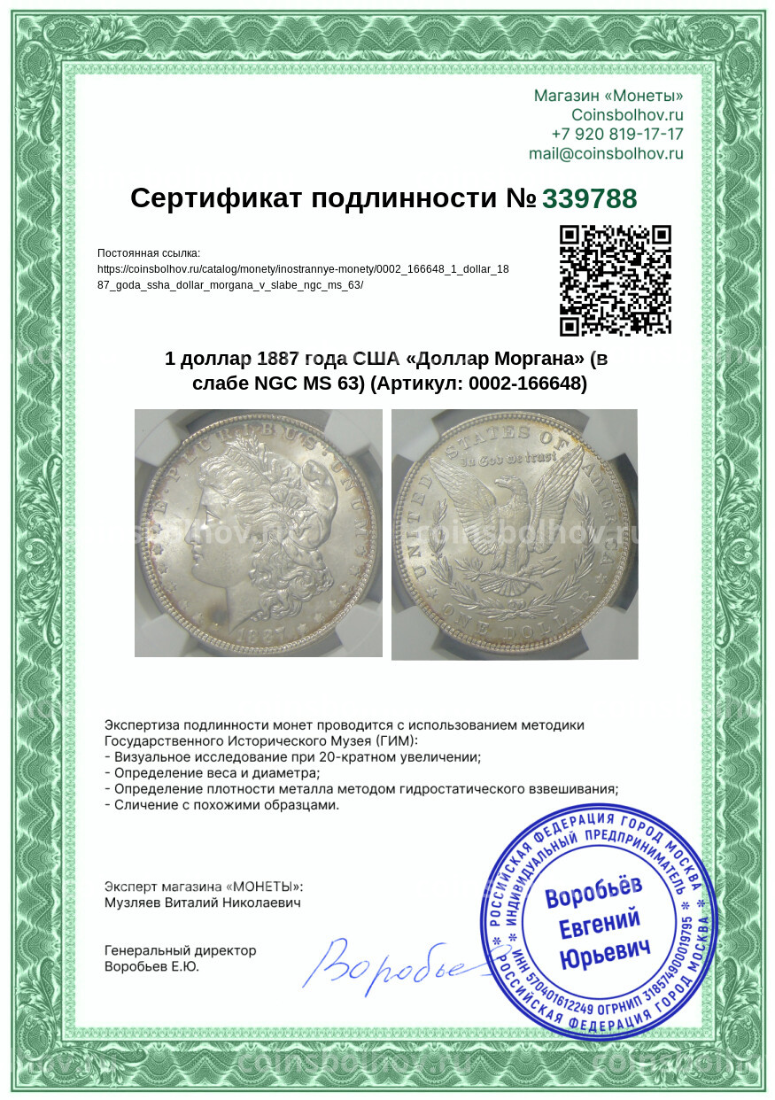 Монета 1 доллар 1887 года США «Доллар Моргана» (в слабе NGC MS 63)
