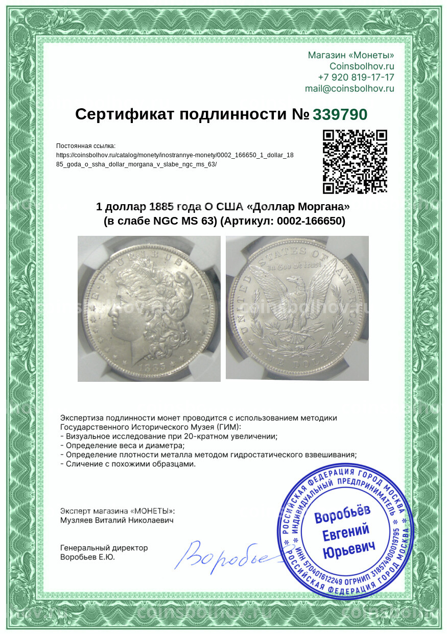 Монета 1 доллар 1885 года О США «Доллар Моргана» (в слабе NGC MS 63)