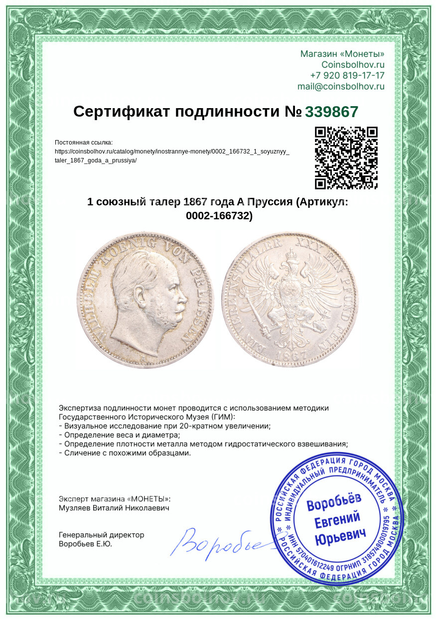 Монета 1 союзный талер 1867 года A Пруссия