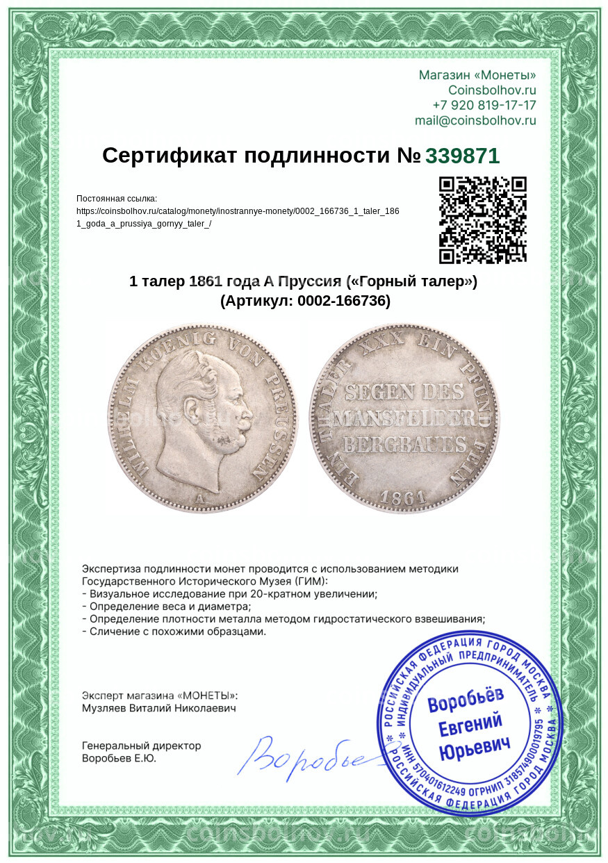 Монета 1 талер 1861 года A Пруссия («Горный талер»)