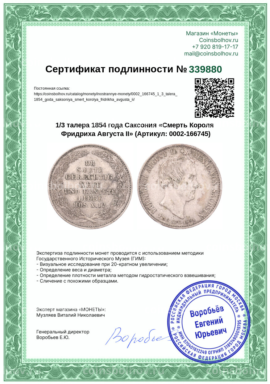 Монета 1/3 талера 1854 года Саксония «Смерть Короля Фридриха Августа II»