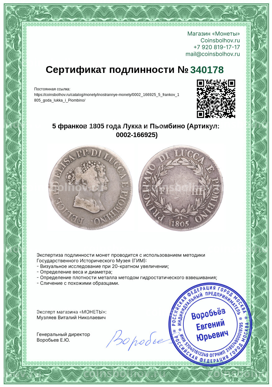 Монета 5 франков 1805 года Лукка и Пьoмбино