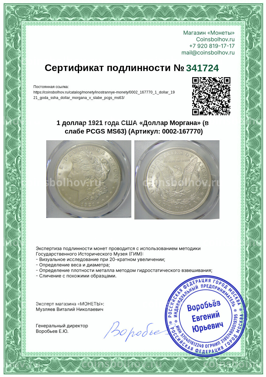 Монета 1 доллар 1921 года США «Доллар Моргана» (в слабе PCGS MS63)