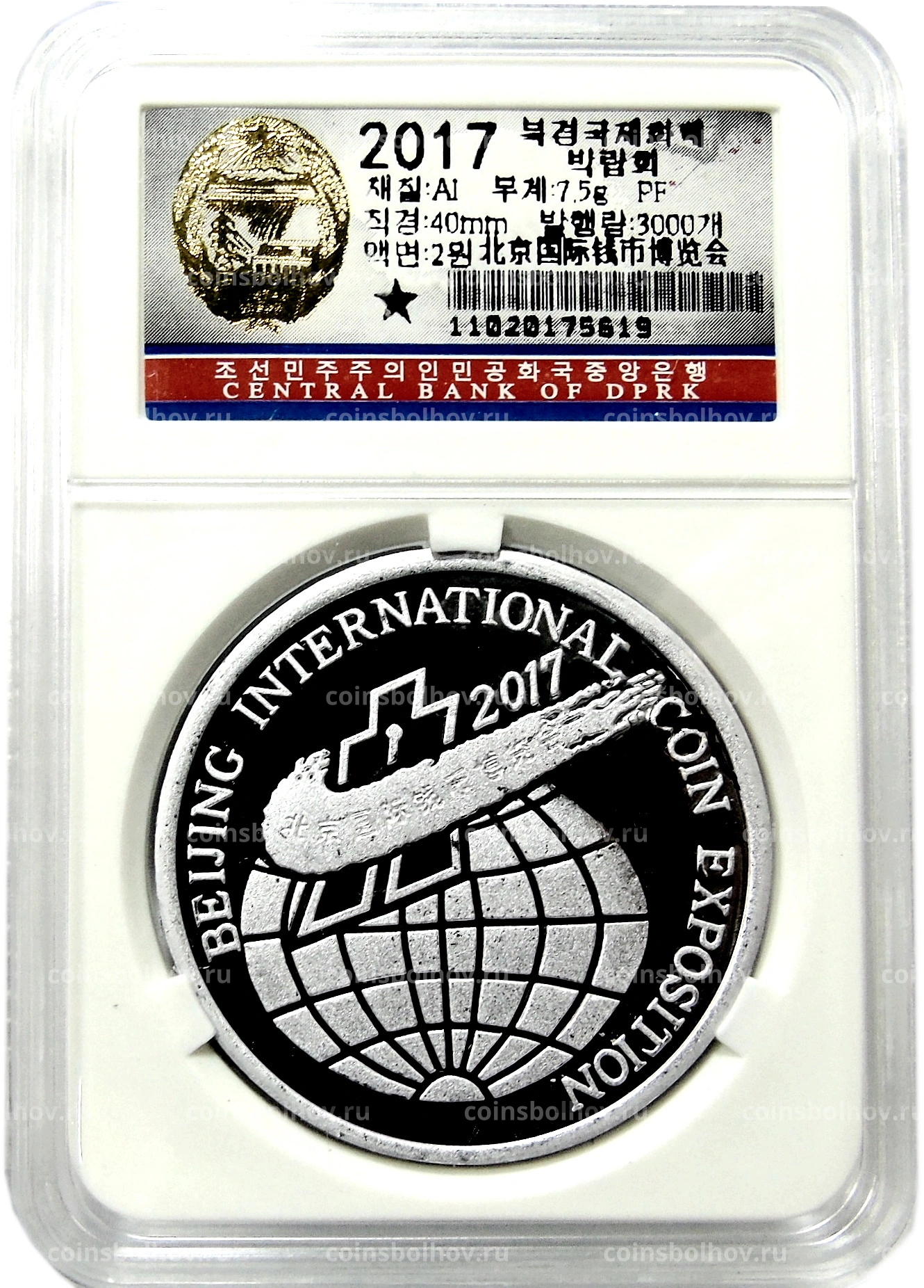 Монета 2 воны 2017 года Северная Корея «Пекинская Международная выставка монет» (В слабе Центрального банка КНДР)