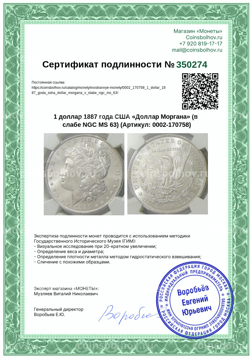 Монета 1 доллар 1887 года США «Доллар Моргана» (в слабе NGC MS 63)