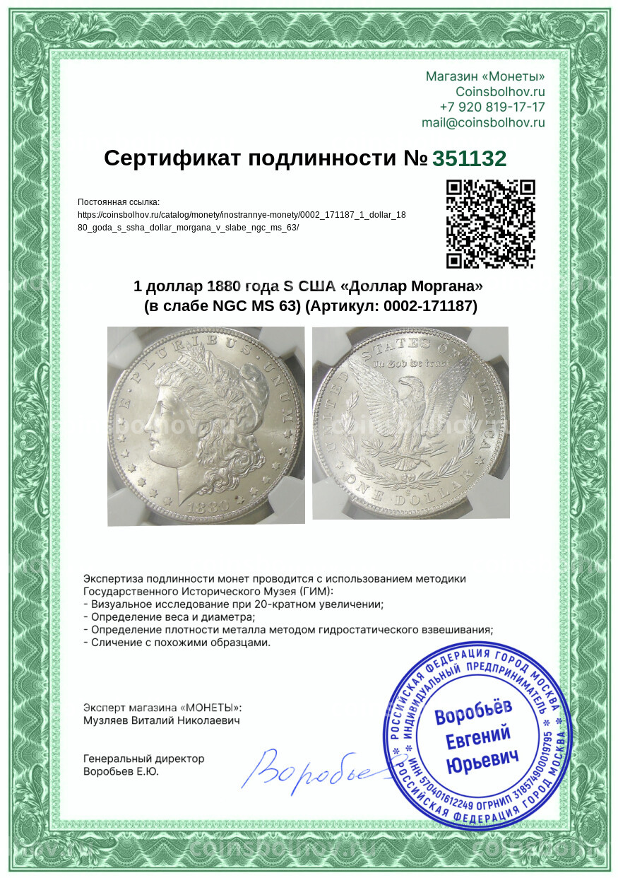 Монета 1 доллар 1880 года S США «Доллар Моргана» (в слабе NGC MS 63)